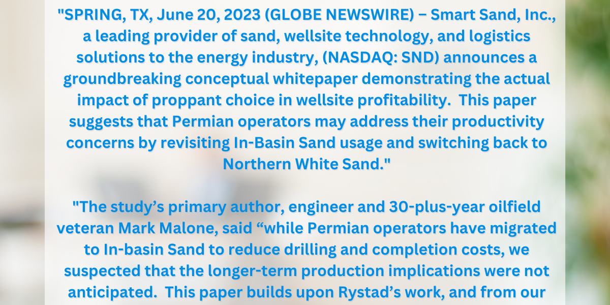 SPRING, TX, June 20, 2023 (GLOBE NEWSWIRE) – Smart Sand, Inc., a leading provider of sand, wellsite technology, and logistics solutions to the energy industry, (NASDAQ: SND) announces a groundbreaking conceptual whitepaper demonstrating the actual impact of proppant choice in wellsite profitability. This paper suggests that Permian operators may address their productivity concerns by revisiting In-Basin Sand usage and switching back to Northern White Sand.